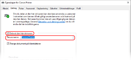 Markera kryssrutan [Dela ut den här skrivaren] på fliken [Delning] och ange ett delat namn.