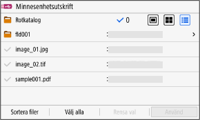 Tryck på [Välj alla] nederst på skärmen om du vill välja alla filer som visas. Om det finns både PDF-filer och bildfiler (JPEG- och TIFF-filer) öppnas en skärm för att välja filtyp. På skärmen anger du den filtyp som du vill skriva ut.