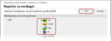 Redigering eller sletning af registrerede destinationerDu kan redigere de registrerede oplysninger ved at klikke på den destination, du vil redigere på skærmen i trin 4. I trin 4 skal du klikke på [Slet] til højre for den destination, du ønsker at slette, og destinationen vil blive slettet. Hvis destinationen i adressekartoteket er angivet med "Favoritindstillinger," anvendes redigerings- eller sletningshandlingen også i "Favoritindstillinger." Registrering og hentning af favoritindstillinger |