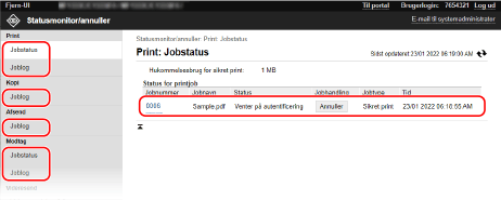 Hvis du indtastede dit navn i [Brugernavn], da du loggede på med generel brugertilstand, er det kun status for udskriftsjob for den pågældende bruger, der er synlige.