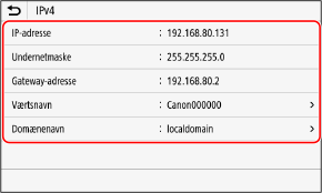 Du kan få vist indstillingerne for IP-adressen, der er indstillet til maskinen, såsom IPv4-adressen og IPv6-adressen.