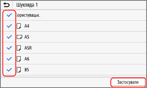 На екрані параметрів паперу відображаються зареєстровані розміри паперу, що часто використовуються. Якщо відображаються невикористовувані розміри паперу, їх можна приховати для кожного джерела паперу, щоб полегшити вибір розміру паперу.