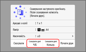 Можна вибрати колірний режим (чорно-білий або кольоровий) для кожного паспорта. Щоб копіювати наступний паспорт у чорно-білому режимі, натисніть [Сканувати далі Ч/Б]. Щоб копіювати у кольоровому режимі, натисніть [Сканувати далі Кольор.].
