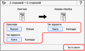 3 | Встановіть орієнтацію і тип оригінальної обробки та натисніть [Застосувати]. Знову з’явиться екран [Інші параметри]. |