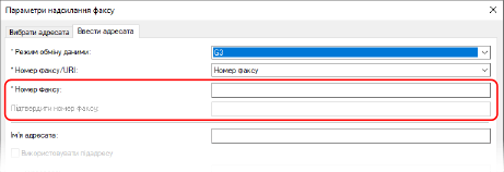 На вкладці [Ввести адресата] введіть номер факсу. Коли можна буде ввести [Підтвердити номер факсу], введіть той самий номер факсу.