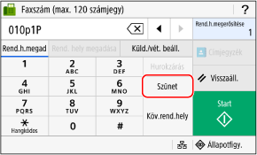 [Beállítások/Bejegyzés] [Küldési beállítások] [Faxküldési beállítások] [Szerkesztés] a [Szünet ideje] pontnál adja meg a szünet idejét [OK] |