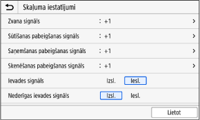 [Zvana signāls], [Sūtīšanas pabeigšanas signāls], [Saņemšanas pabeigšanas signāls], [Skenēšanas pabeigšanas signāls] (modeļiem ar faksa funkciju)