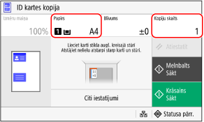 Lai kopētu ID kartes aizmuguri melnbaltā konfigurācijā, nospiediet [Sākt Melnbalts]. Lai iegūtu krāsu kopijas, nospiediet [Sākt Krāsains].