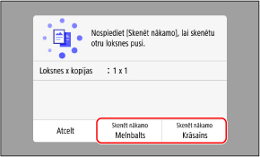 Aizmuguri varat kopēt ar citu krāsu režīmu (melnbalto vai krāsu), kas atšķiras no priekšpusei izmantotā. Lai kopētu aizmuguri melnbaltā konfigurācijā, nospiediet [Skenēt nākamo Melnbalts]. Lai iegūtu krāsu kopijas, nospiediet [Skenēt nākamo Krāsains].