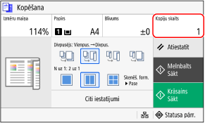Nospiediet [Kopiju skaits], izmantojiet ciparu taustiņus, lai ievadītu kopiju skaitu, un nospiediet [Aizvērt].