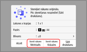 Varat atlasīt krāsu režīmu (melnbaltais vai krāsu) katrai pasei. Lai nākamo pasi kopētu melnbaltā konfigurācijā, nospiediet [Skenēt nākamo Melnbalts]. Lai iegūtu krāsu kopijas, nospiediet [Skenēt nākamo Krāsains].