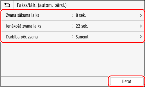 Ja ir iespējota funkcija [Fakss/tālr. (autom. pārsl.)], lai noteiktu, vai ienākošais zvans ir fakss, varat konfigurēt arī tādus iestatījumus kā zvanīšanas reižu skaits.