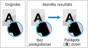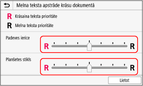 Skenējot krāsainus oriģinālus, varat veikt korekcijas, piešķirot prioritāti gandrīz melnas krāsas teksta (krāsaina teksta) reproducēšanai vai melna teksta saskatāmības uzlabošanai.