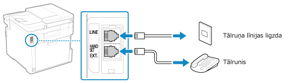 Savienojiet komplektācijā iekļauto tālruņa kabeli ar tālruņa līnijas ligzdu (LINE) iekārtā un ievietojiet to tālruņa līnijas savienotājā sienā.