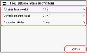 Ezarri hau RX modurako [Faxa/Telefonoa (aldatu automatikoki)] hautatuta dagoenean. Beste RX modu bat hautatu baduzu, ez duzu urrats hori egin behar.