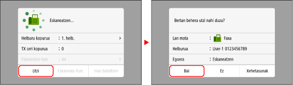 Jarraitu pantailako argibideei fax baten bidalketa bertan behera uzteko.