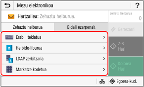 Originala eskaneatu eta eskaneatutako datuak posta elektronikoz eranskin gisa bidal ditzakezu. Ohiko mezu elektroniko bat bidaltzen duzunean bezalaxe, gaia eta mezua gehi ditzakezu, eta hainbat helmuga zehaztu.