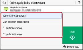 Eskaneatutako datuen formatua, ordenagailuan gordetzeko kokapena eta bestelako ezarpenak eskaneatze-ezarpen bakoitzerako ezartzen dira. Hautatutako eskaneatze-ezarpenaren arabera eskaneatzen da originala.