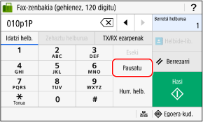 Faxa nazioarteko helmuga batera bidaltzean, sartu nazioarteko sarbide-zenbakia, herrialde-kodea eta helmugaren fax-zenbakia, ordena horretan. Sakatu [Pausatu] zenbakien artean etenaldia gehitzeko.