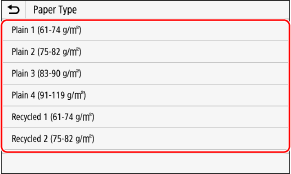 By default, when paper is loaded in the multi-purpose tray, the screen for setting the paper size and type is displayed on the control panel.