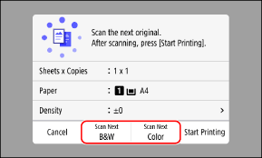 1 | Place the next original on the platen glass, and press [Scan Next B&W] or [Scan Next Color]. The next original is scanned, and the same screen is displayed. Repeat this process until scanning of all originals is completed. You can select the color mode (Black & White or Color) for each original. To copy the next original in black and white, press [Scan Next B&W]. To copy in color, press [Scan Next Color]. You can also press [Density], [Original Type], and [Color Balance] to change the settings for each original. If the size of the original is different, part of the image may be missing, or the image may be printed smaller on the paper. |