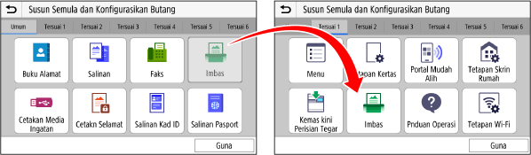 Anda boleh menyusun semula butang pada skrin [Rumah] dan mengalihkan butang ke tab lain.