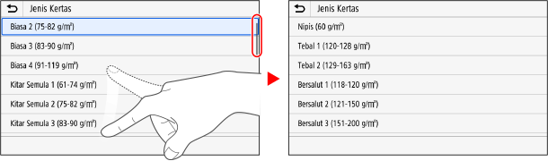 Apabila palang tatal muncul di skrin, ia menunjukkan bahawa terdapat item atau maklumat yang tidak dapat dipaparkan sepenuhnya pada skrin. Jentik atau seret untuk menatal skrin mengikut arah anda menggerakkan hujung jari anda.