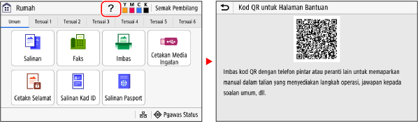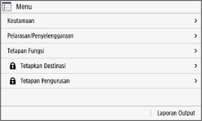 Menukar Paparan SkrinAnda boleh menukar paparan panel kawalan seperti menukar bahasa dan unit paparan, serta menunjukkan atau menyembunyikan mesej. [Tetapan Paparan] Anda boleh menyongsangkan warna skrin dan melaraskan kecerahan untuk membuatkan skrin lebih mudah dilihat. [Kebolehcapaian] Mengosongkan Tetapan Secara AutomatikSecara lalai, jika tiada operasi dijalankan selepas tempoh masa tertentu, tetapan yang dikonfigurasi pada skrin akan dikosongkan, dan skrin [Rumah] dipaparkan. Anda boleh menukar masa hingga tetapan ini dikosongkan dan skrin yang dipaparkan selepasnya. [Masa Set Semula Auto] [Fungsi Slepas Set Semula Auto] |