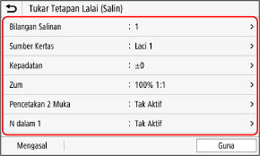 Anda juga boleh menetapkan semula tetapan kepada tetapan yang ditetapkan di sini dengan menekan [Set Semula] pada sebarang skrin fungsi.