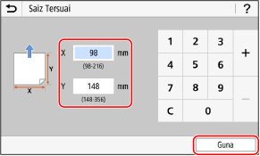 2 | Masukkan nilai di [X] dan [Y], dan tekan [Guna]. Apabila saiz bukan standard yang sering digunakan didaftarkan, anda boleh memanggilnya dengan menekan [S1] hingga [S3]. |