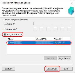 2 | Pilih [Pengesanan Auto] dan mesin, dan klik [Seterusnya]. Jika mesin tidak dipaparkan, klik [Segar semula]. Jika mesin masih tidak dipaparkan, pilih [Alamat IP] atau [Alamat MAC], masukkan alamat IP atau alamat MAC mesin, dan kemudian klik [Seterusnya]. |