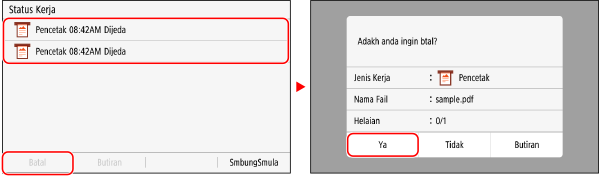 Jika skrin senarai tugas dipaparkan, pilih tugas untuk dibatalkan, dan tekan [Batal]