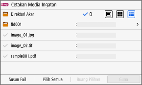Untuk memilih semua fail yang dipaparkan, tekan [Pilih Semua] di bahagian bawah skrin. Jika terdapat kedua-dua fail PDF dan fail imej (fail JPEG atau TIFF), skrin untuk memilih jenis fail akan dipaparkan. Gunakan skrin ini untuk memilih jenis fail yang ingin dicetak.