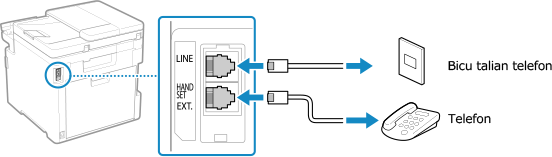 5 | Sambungkan kabel telefon yang dibekalkan ke soket talian telefon (LINE) pada mesin dan penyambung talian telefon di dinding. ![]() Sambungkan telefon kepada bicu telefon luaran (SET TANGAN/SAMBUNG) pada mesin. Apabila menyambungkan telefon dengan fungsi faks, pastikan anda menyahdayakan tetapan terima automatik faks pada telefon. Bergantung pada jenis telefon yang disambungkan padanya, mesin mungkin tidak dapat menghantar atau menerima faks dengan betul. |