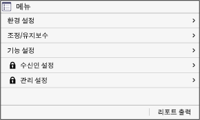 이 화면은 [홈] 화면에서 [메뉴]를 누르면 표시됩니다. 이 화면을 사용하여 기기의 다양한 설정을 구성합니다.