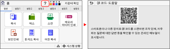 일부 오류 코드 또는 오류가 표시되는 일부 화면에는 사용자 안내서의 관련 페이지에 액세스할 수 있는 QR 코드가 표시됩니다.