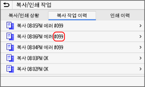 인쇄를 수행할 수 없거나, 스캔한 데이터 또는 팩스를 전송하거나 수신할 수 없거나, 다른 오류가 발생하는 경우, 보고서나 작업 로그에 오류 코드("#"로 시작하는 세 자리 숫자)가 표시됩니다.