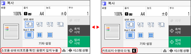 오류가 발생하거나 기기에 용지가 없거나 토너 카트리지에 토너가 없으면 화면에 메시지가 표시됩니다.