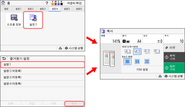 조작 패널의 [홈] 화면과 각 기능의 화면에 추가된 바로 가기 버튼을 사용하여 등록된 설정을 호출하고 작업을 빠르게 수행할 수 있습니다. 또한 설정을 호출한 후 필요에 따라 설정을 변경할 수도 있습니다.