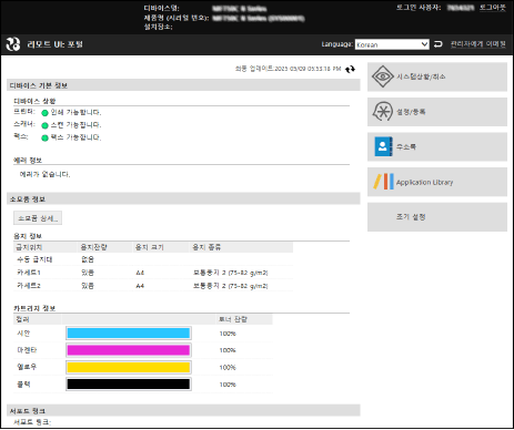 리모트 UI에 로그인하면 포털 페이지(리모트 UI 상위 페이지)가 나타납니다. 여기서 기기의 작동 상태를 확인하고, 다양한 정보를 보고, 단추 조작으로 설정을 변경할 수 있습니다.