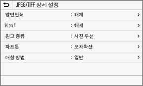 이 화면을 표시하려면 메모리 미디어 인쇄 설정 화면에서 [JPEG/TIFF 상세 설정]을 누릅니다.