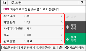 | | 원고를 스캔하고 스캔한 데이터를 기기에 연결된 USB 메모리 장치에 저장할 수 있습니다. 이렇게 하면 네트워크에 연결되지 않은 컴퓨터에서 스캔한 데이터를 사용할 때나 이동 중일 때 편리합니다. |