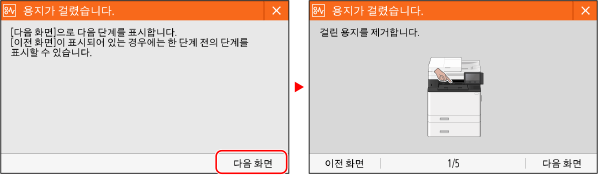 기기에서 걸린 용지를 억지로 제거하지 마십시오.용지를 억지로 제거하면 신체에 부상을 입거나 기기의 부품이 손상될 수 있습니다. 용지를 제거할 수 없는 경우 대리점이나 서비스 담당자에게 문의하십시오. 문제가 지속되는 경우 모든 용지 걸림을 제거한 경우옷과 손이 롤러에 걸리지 않도록 기기와 옵션 장비에서 즉시 손을 떼십시오. |