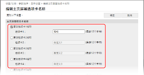 在计算机中使用远程用户界面重命名选项卡。无法使用操作面板重命名选项卡。