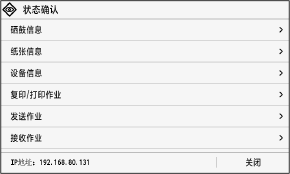 此屏幕将在按下 [主页] 屏幕上和其他位置的 [状态确认] 后显示。使用此屏幕可以检查机器信息、使用情况和日志、网络设置和错误信息。