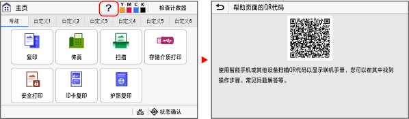 QR 码将在点击 [主页]、[传真] 或 [扫描] 屏幕上的 [