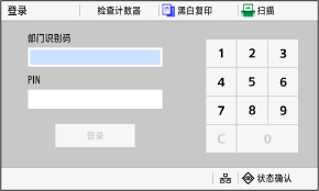 如果设置了部门 ID 管理,会显示以下登录屏幕。请输入部门 ID 进行登录。如果设置了 PIN,请输入 PIN。