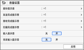 [振铃提示音]、[发送完成提示音]、[接收完成提示音]、[扫描完成提示音](适用于具有传真功能的型号)