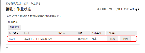 单击作业编号时,会显示 [作业详细信息] 屏幕。可查看接收时间和页数,以及预览传真。