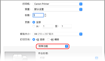 2 | 从打印选项弹出菜单中,选择 [特殊功能]。 如未显示打印选项,请单击打印对话框中的 [显示详细信息]。 |